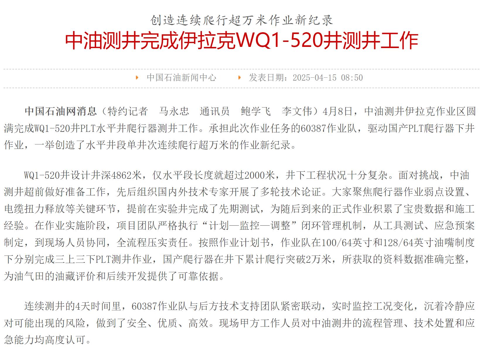 該設備于2025年4月8日在中石油國際公司嚴格高效施工管理下,圓滿完成WQ1-520井的萬米PLT水平井爬行器測井作業(yè),一舉創(chuàng)造了水平井段連續(xù)爬行超萬米累計爬行突破2萬米零故障的作業(yè)新紀錄!